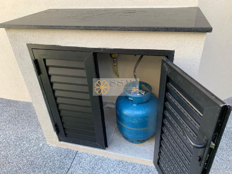 Área gourmet com churrasqueira e pia de apoio coberta
