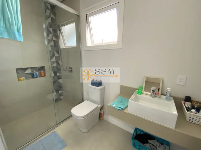 - A casa possui 4 suítes sendo uma para visitas no andar térreo com porta e banheiro de dimensões para cadeira de rodas e outras 3 suítes para a família no andar superior, todas com closet e persianas automáticas. A suíte máster possui banheira de hidromassagem Jacuzzi para 2 pessoas, pia dupla, 2 chuveiros de teto e sala íntima com vista para a Serra do Japi.