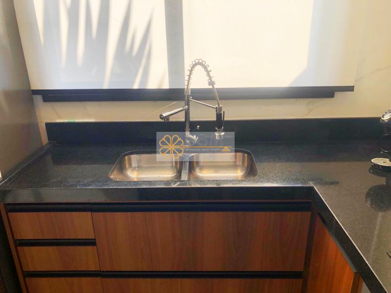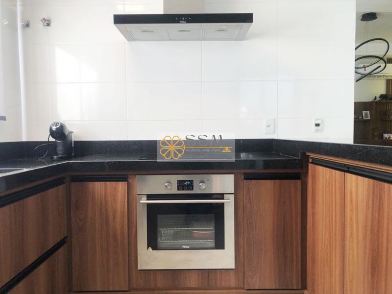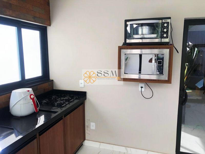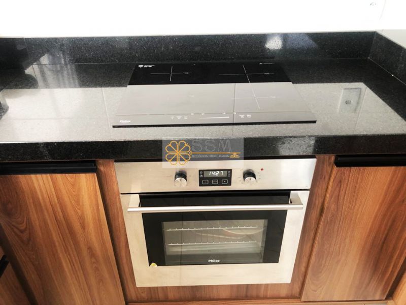 Cozinha com cooktop, forno, coifa e microondas